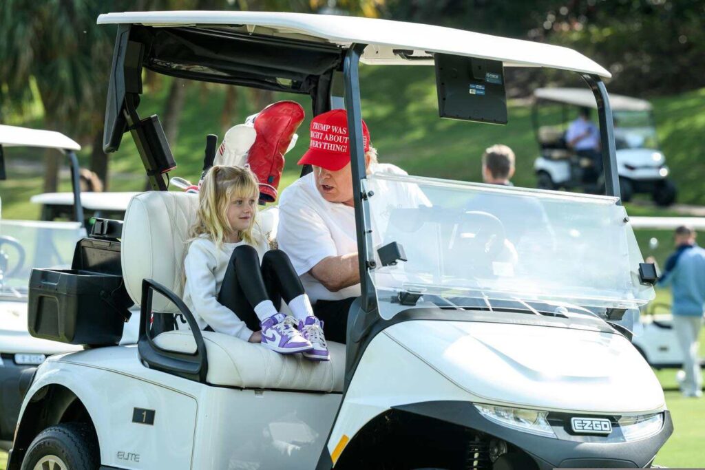 The images show her young daughter enjoying a relaxed golf outing with her grandfather, US President Donald Trump. In the photos, the president is seated behind the wheel of a golf cart while his granddaughter Carolina rides beside him, appearing at ease and cheerful.